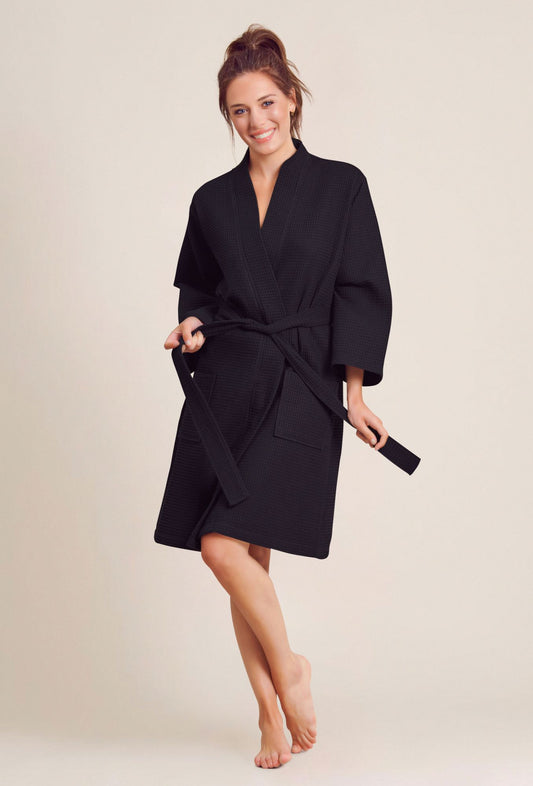 Black Kimono Waffle Robe - Women's Bath SPA Robe - Lightweight Cotton & Polyester Blend