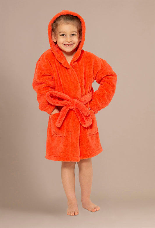Boys Hooded Coral Robe of Plush Microfleece. Soft, Warm with 2 Pockets & Belt