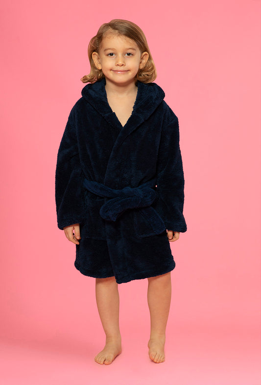 Boys Hooded Navy Robe of Plush Microfleece. Soft, Warm with 2 Pockets & Belt