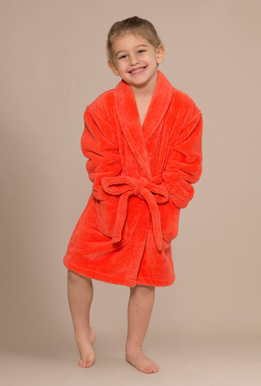 Boys Hooded Coral Robe of Plush Microfleece. Soft, Warm with 2 Pockets & Belt