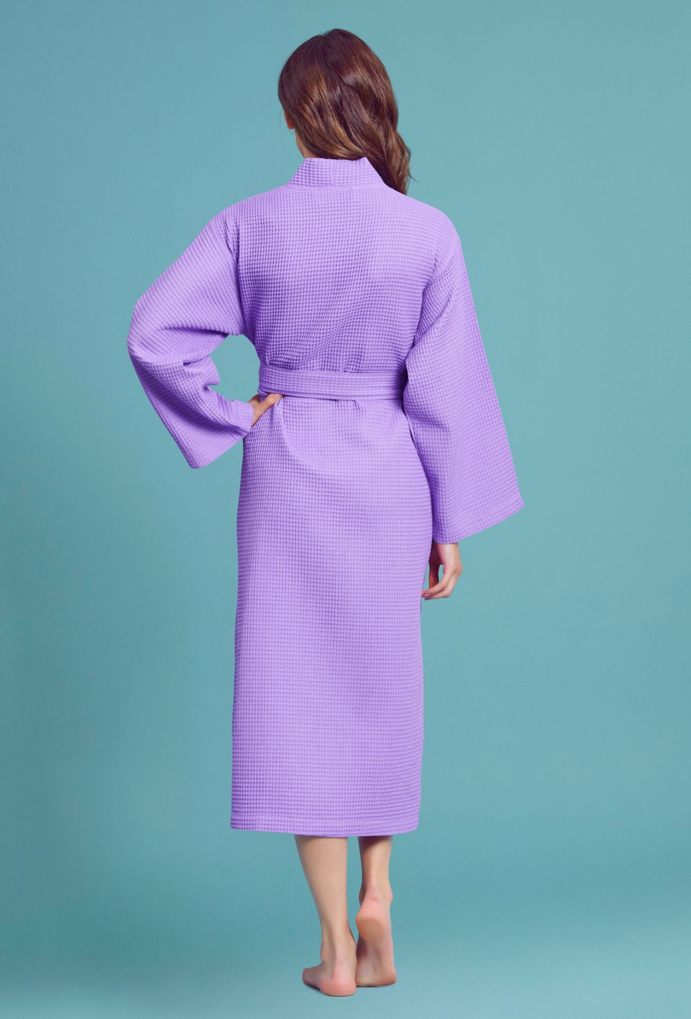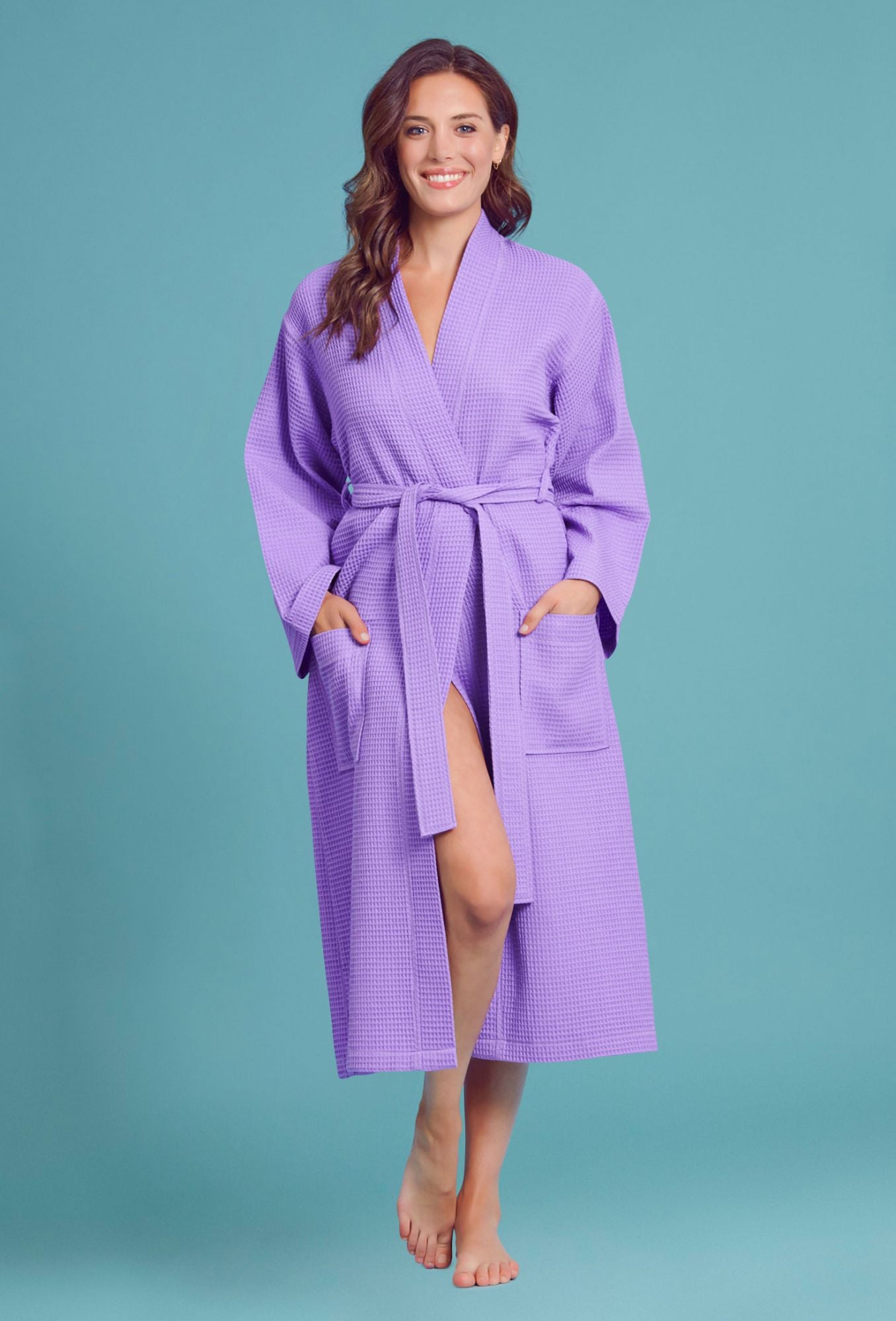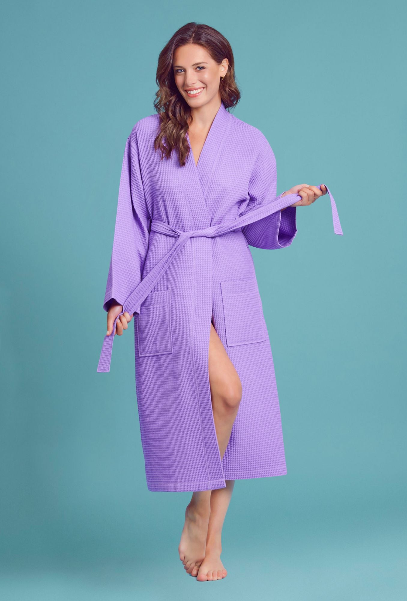 The long length and loop through belt featured in the design of this luxuriously lightweight bathrobe allow women to enjoy spa quality in the comfort of their own homes. Though light, the premium cotton kimono towel offers amazing absorbency. Available in white, pink, navy and other colors, the waffle serves as a pool coverup, bathrobe or spa wrap.