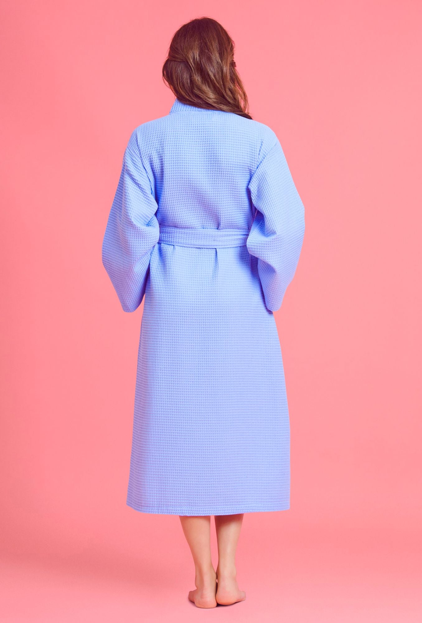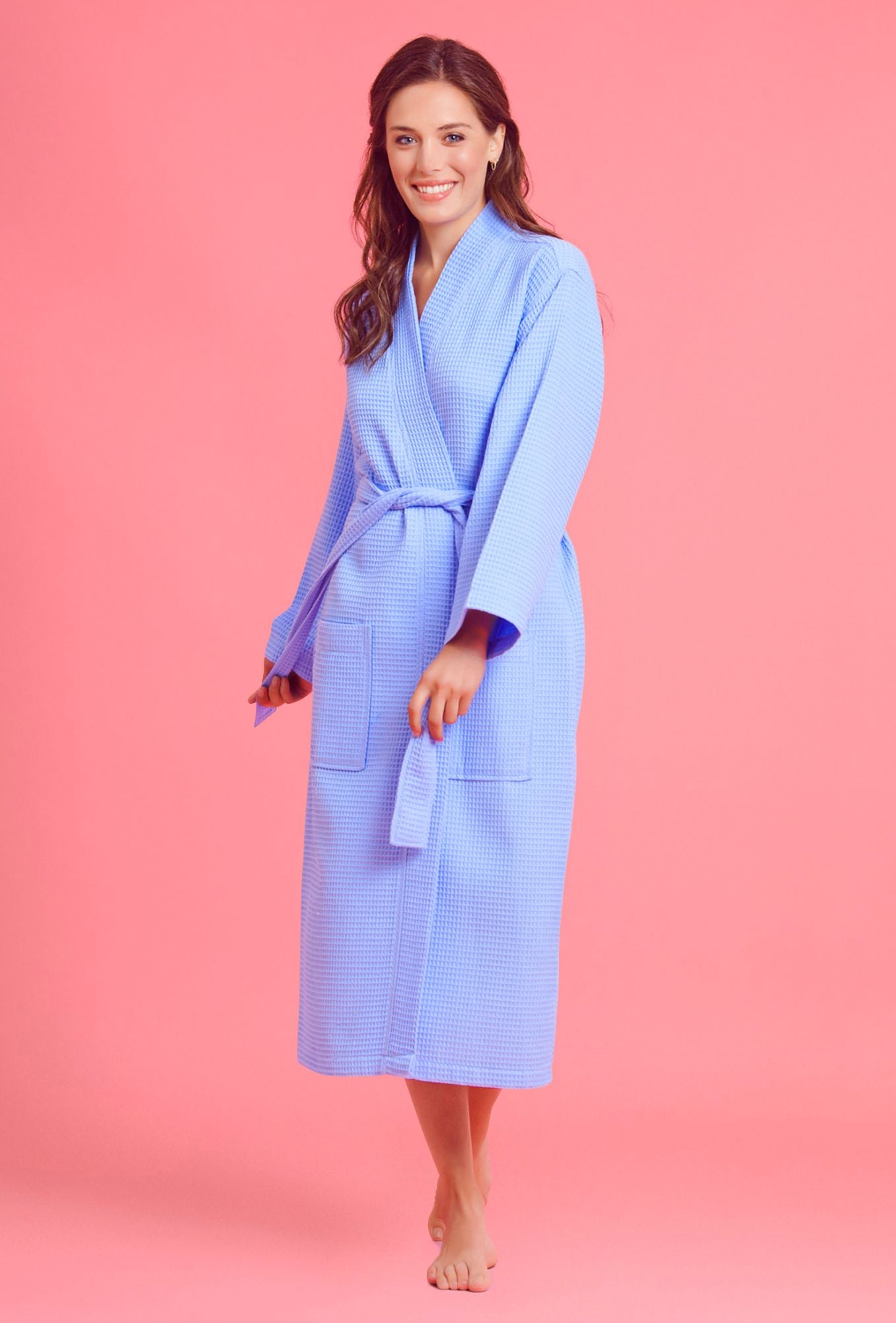 The long length and loop through belt featured in the design of this luxuriously lightweight bathrobe allow women to enjoy spa quality in the comfort of their own homes. Though light, the premium cotton kimono towel offers amazing absorbency. Available in white, pink, navy and other colors, the waffle serves as a pool coverup, bathrobe or spa wrap.