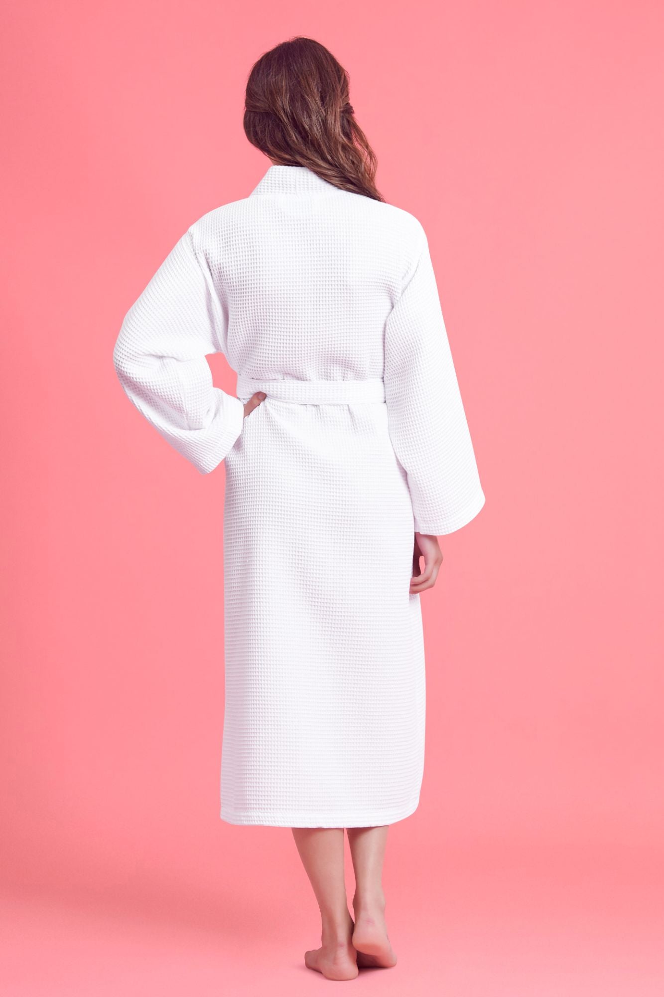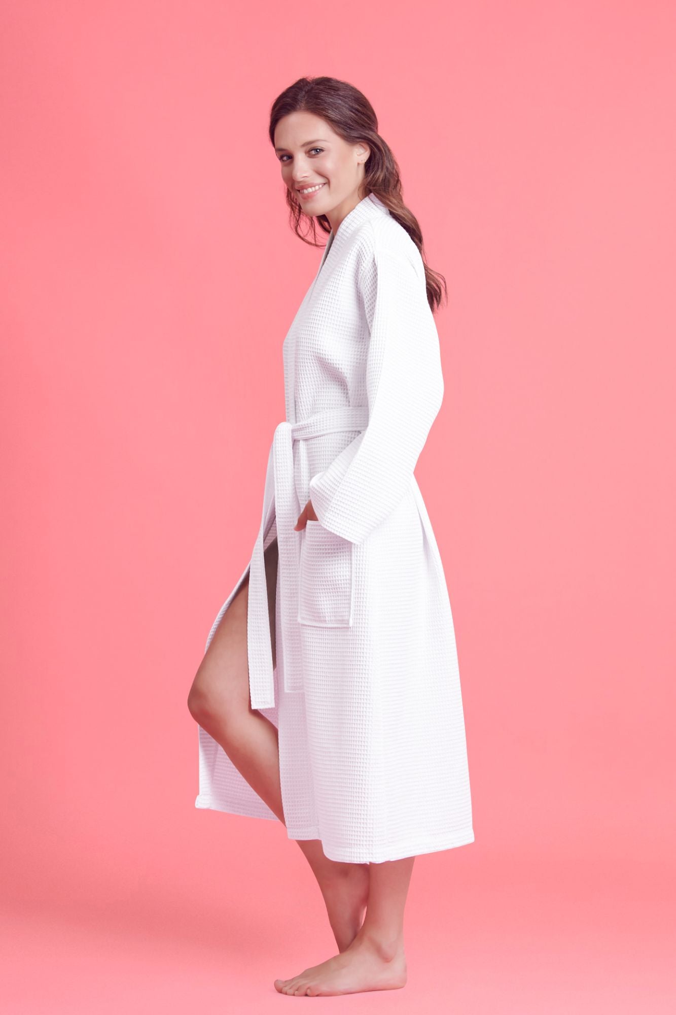 The long length and loop through belt featured in the design of this luxuriously lightweight bathrobe allow women to enjoy spa quality in the comfort of their own homes. Though light, the premium cotton kimono towel offers amazing absorbency. Available in white, pink, navy and other colors, the waffle serves as a pool coverup, bathrobe or spa wrap.